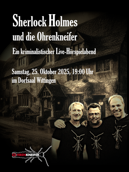 Seid dabei, wenn wir am 25.10.25 im Schützenhaus Hagen, Hagen 16b in 29379 Witingen (Niedersachsen) einen unvergesslichen Live-Hörspiel-Abend präsentieren! Freut euch auf ein spannendes, selbstgeschriebenes Kriminalstück, sowie auf eine bisher unbekannte Geschichte aus dem legendären Sherlock Holmes Universum. Ein Abend voller Unterhaltung, Spannung und Humor erwartet euch!